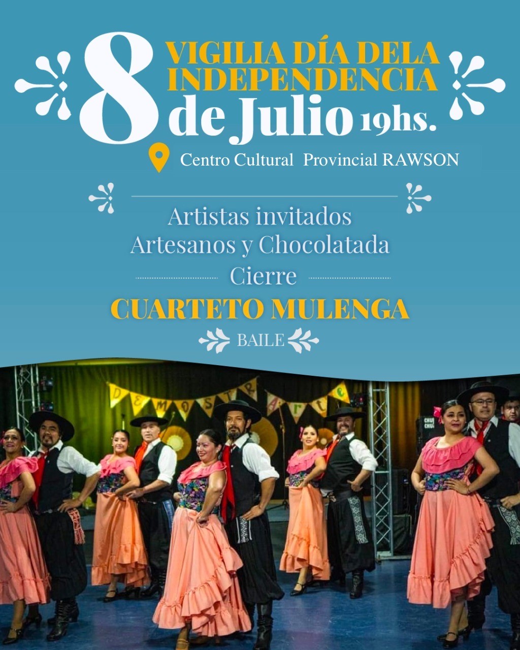 Organizada por el Gobierno del Chubut a través de la Secretaría de Ciencia y Cultura, con la colaboración de los Ministerios de Infraestructura, Energía y Planificación, de Turismo y Áreas Protegidas, la dirección general de Defensa Civil, Gendarmería Nacional y la secretaría de Turismo, Cultura, Deporte y Comunicación de Rawson, el próximo viernes 8 de Julio se celebrará la fiesta patria en una hermosa jornada con diversidad de actividades culturales.