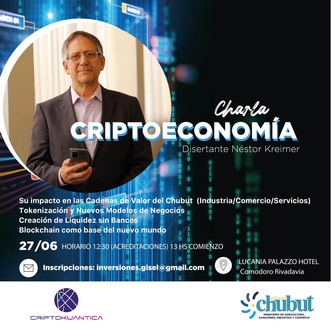 La disertación, que tendrá lugar en el Lucania Palazzo Hotel de Comodoro Rivadavia, estará a cargo del contador y psicólogo social Néstor Kreimer, reconocido y destacado especialista en la materia de la economía digital y las inversiones. La actividad, que será libre y gratuita, las acreditaciones serán a las 12.30 horas y comenzará a las 13 horas.