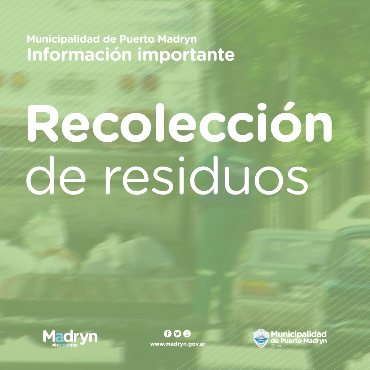La Secretaría de Ecología y Protección Ambiental de la Municipalidad de Puerto Madryn informa que la recolección de residuos a cargo de la empresa Ashira se llevará a cabo con normalidad el sábado 18 y el lunes 20 de junio. No habrá servicio el domingo 19, como es habitual, ni el viernes 17 de junio debido al feriado nacional.