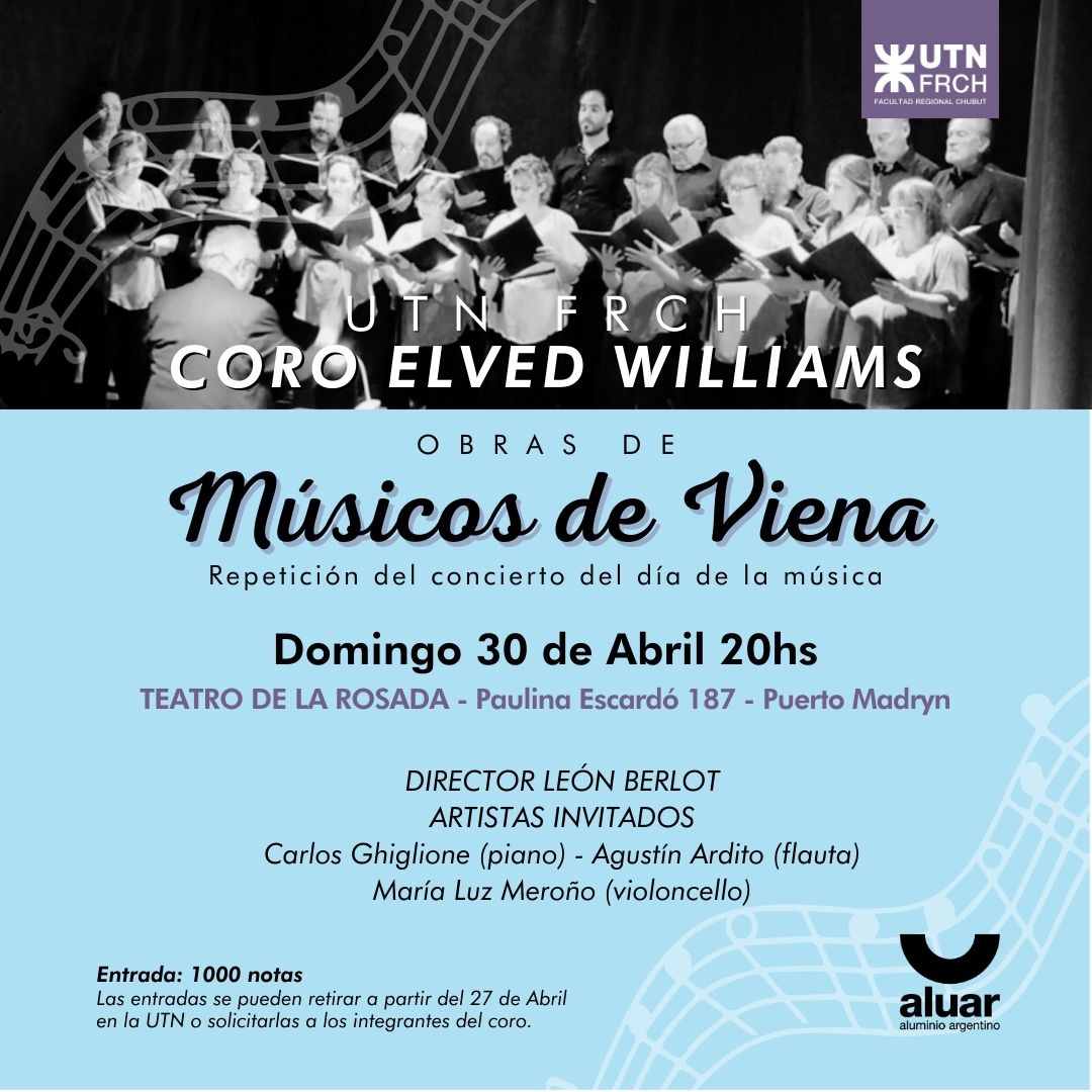 El próximo domingo 30 de Abril, en el Teatro “La Rosada” (ubicado en Paulina Escardo 187) de Puerto Madryn, se presentará el coro “Elved Williams” dirigido por el maestro León Berlot, de la Facultad regional Chubut de la Universidad Tecnológica Nacional (UTN – FRCh).