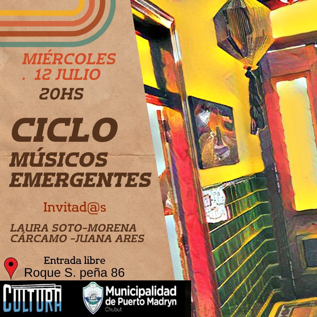 Será este miércoles 12 de julio a las 20 horas en la Casa de la CulturaAcompañado por la Subsecretaría de Cultura de la Municipalidad de Puerto Madryn, este miércoles 12 a las 20 horas se realizará una nueva edición del ciclo “Músicos Emergentes”. La cita será en la Casa de la Cultura, ubicada en Roque Sáenz Peña 86. En esta oportunidad, participarán como invitadas Laura Soto, Morena Cárcamo y Juana Ares.MÚSICOS EMERGENTESEl ciclo está destinado y enfocado a que los alumnos y alumnas de los talleres municipales que se desarrollan en la Casa de la Cultura tengan sus primeras experiencias presentándose ante un público.En este espacio, los jóvenes tienen la experiencia de desenvolverse artísticamente, tocando en vivo, con puesta en escena, armado y desarmado de sonido y equipos y ensayos.Este ciclo es realizado por los profesores Juan Solco (percusión), Agustín Urrutia (piano), Martín Martínez (Guitarra y ukelele) Fabián Alfaro (acordeón) y Gody Corominas (entrenamiento vocal). La producción está a cargo de Gustavo Gelpi.