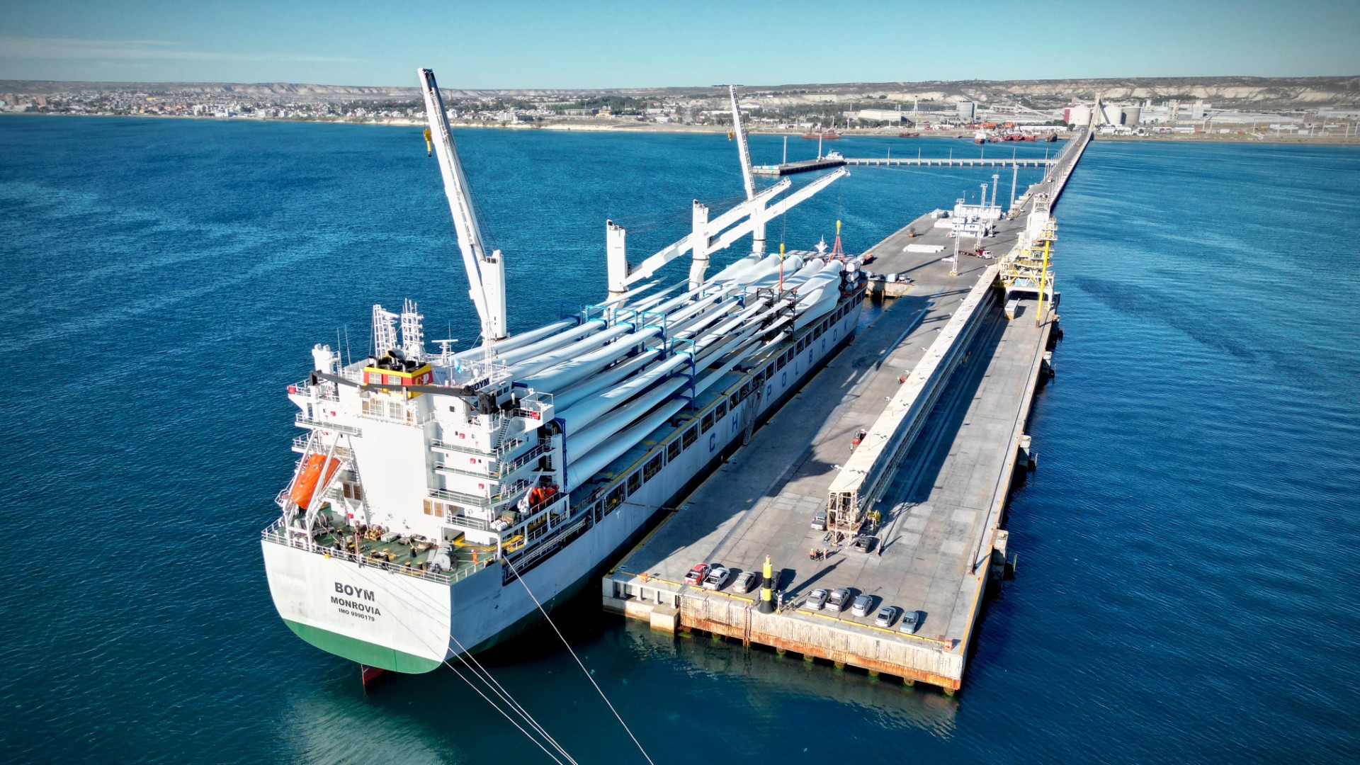 El Boym es el primero de seis buques que transportarán los componentes necesarios para este proyecto que suma un total de 56 aerogeneradores. En esta ocasión, la embarcación arribó con las partes de 10 aerogeneradores completos (excepto las torres) y 6 aspas de repuesto para los parques ya instalados.