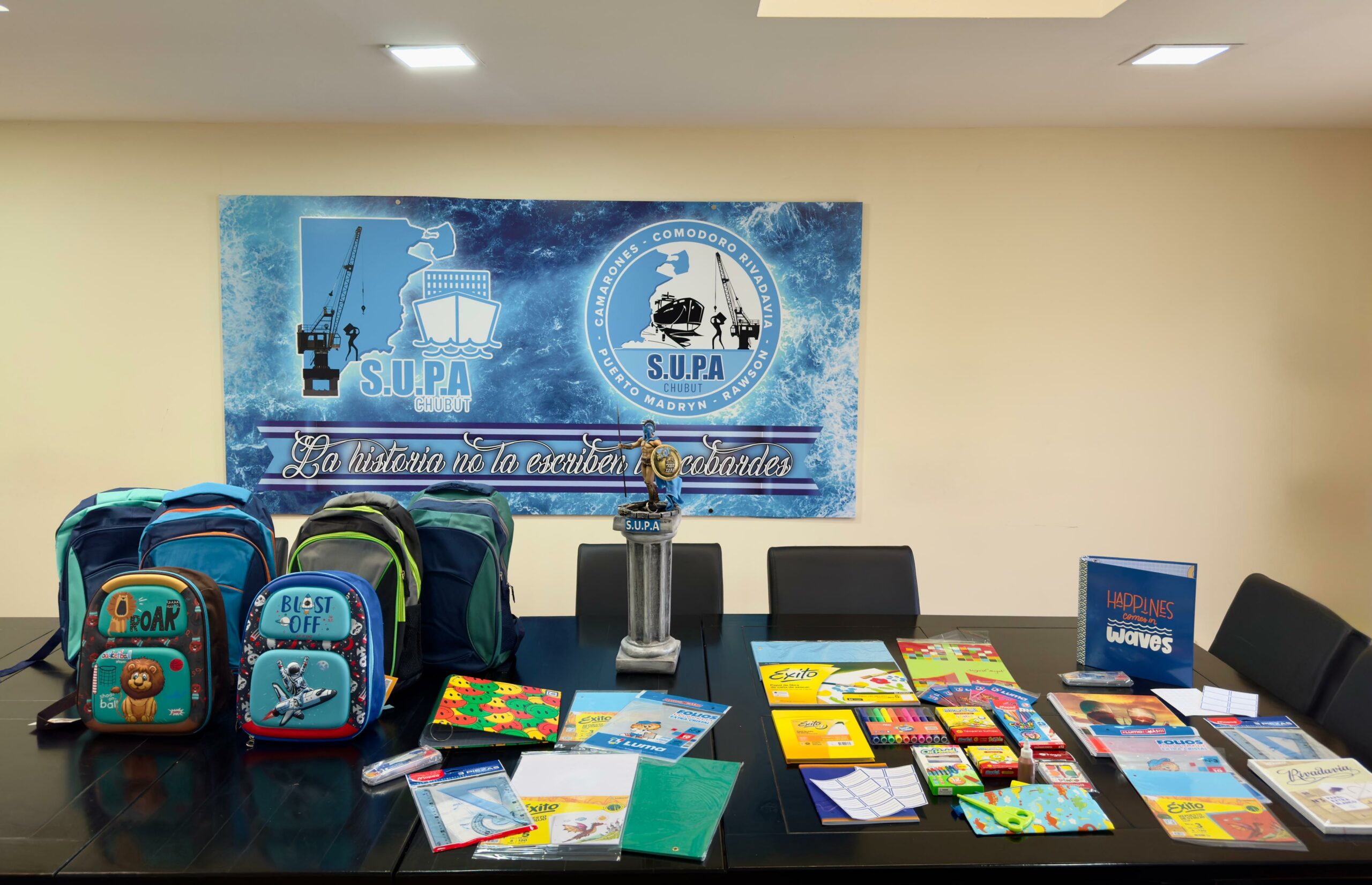 Continuando con las palabras, el Secretario General del Supa Chubut, expresó: “Desde que asumimos la responsabilidad de representar a los estibadores de los cuatro puertos de la provincia, una de nuestras premisas es que el aporte de afiliado, vuelva al estibador en obras y beneficios. Tal es el caso de los Kits escolares, cómo también la entrega de indumentaria, que hace años no se hacía y las obras hechas y las que se van a realizar”.