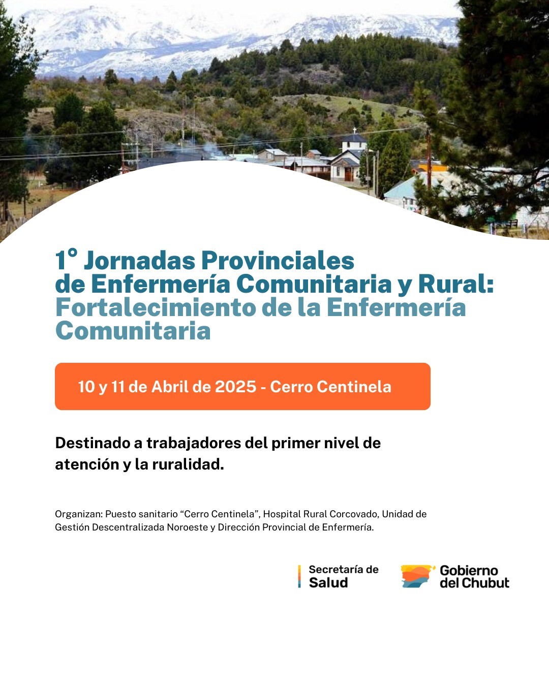 Como parte de las múltiples instancias de capacitación que impulsa la gestión del gobernador Ignacio “Nacho” Torres, el Gobierno del Chubut a través de la Secretaría de Salud invita a participar a los integrantes del equipo de salud de las “1° Jornadas Provinciales de Enfermería Comunitaria y Rural: Fortalecimiento de la Enfermería Comunitaria”, que se realizarán los días jueves 10 y viernes 11 de abril en la comuna de Cerro Centinela.