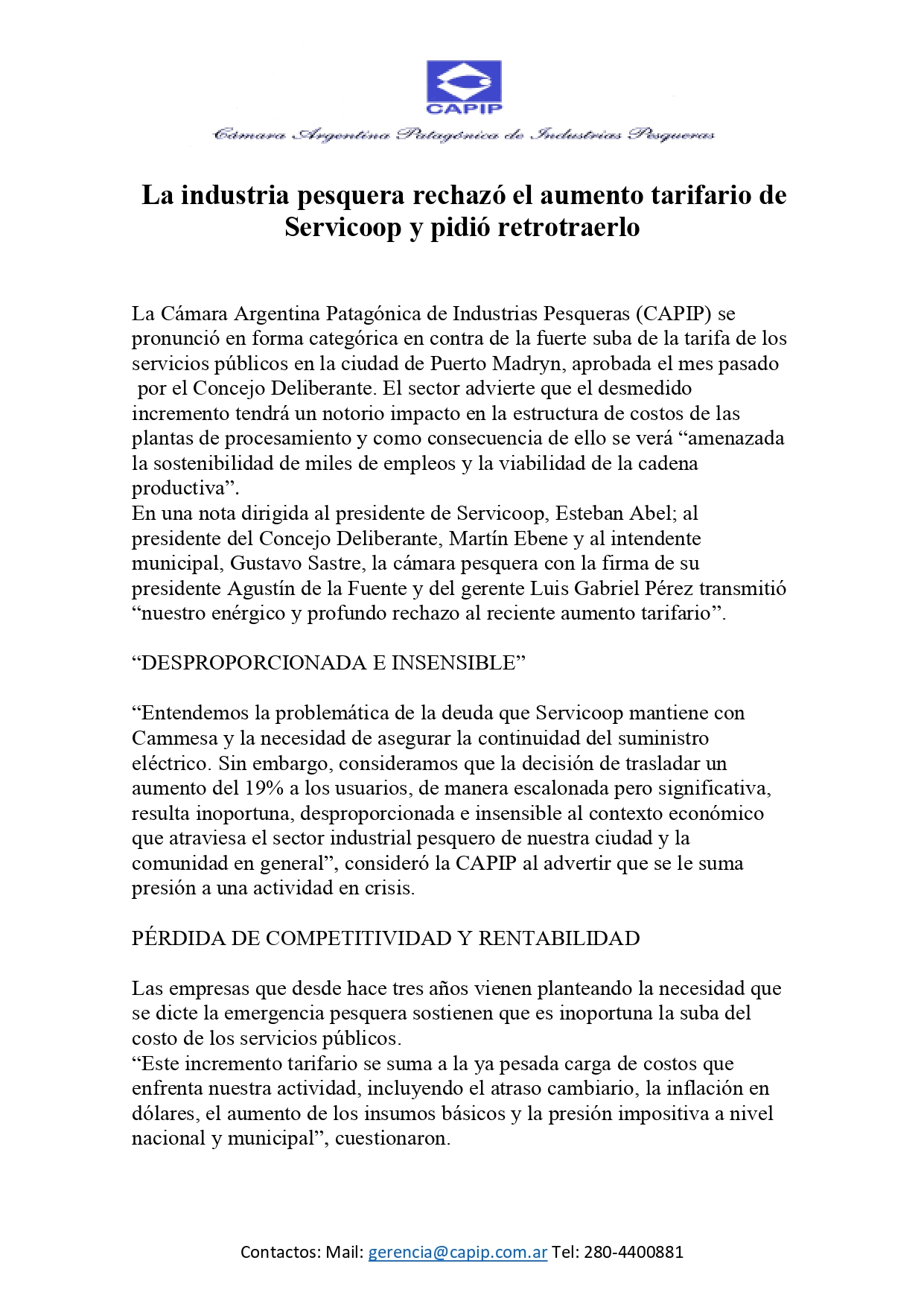 La Cámara Argentina Patagónica de Industrias Pesqueras (CAPIP) se pronunció en forma categórica en contra de la fuerte suba de la tarifa de los servicios públicos en la ciudad de Puerto Madryn, aprobada el mes pasado por el Concejo Deliberante. El sector advierte que el desmedido incremento tendrá un notorio impacto en la estructura de costos de las plantas de procesamiento y, como consecuencia de ello, se verá “amenazada la sostenibilidad de miles de empleos y la viabilidad de la cadena productiva”.
