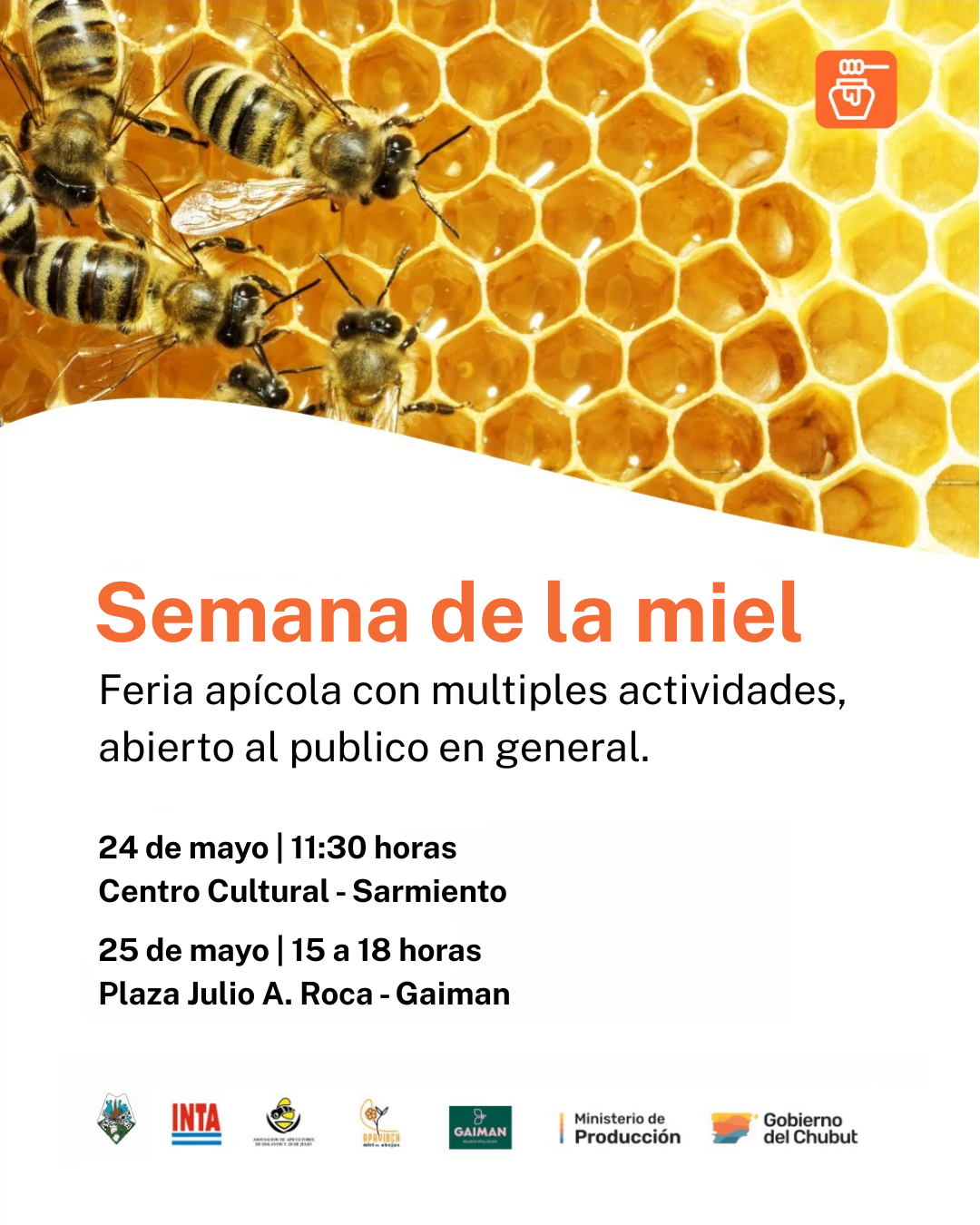 Siguiendo con el cronograma, el domingo 25 de mayo a partir de las 15 horas en la localidad de Gaiman también participarán Asociaciones de Productores Apícolas, INTA, Apavirch, Asociación de Apicultores de Dolavon y 28 de Julio, que se suman a la feria apícola que tendrá lugar en la Plaza Julio A. Roca.