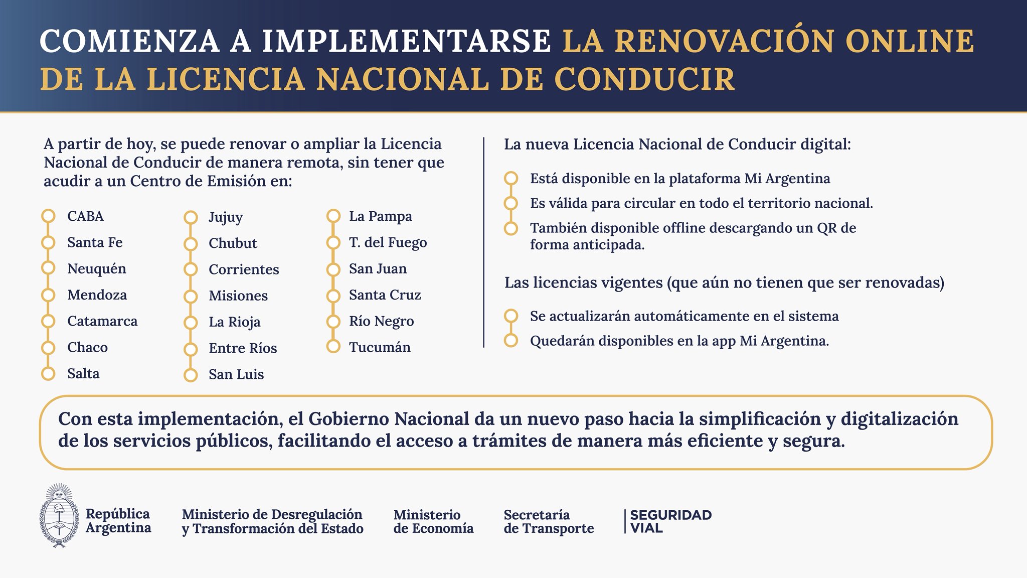 El nuevo sistema permitirá gestionar desde el celular o la computadora la renovación, ampliación o emisión por primera vez de la licencia de conducir. Al finalizar el trámite, los conductores podrán contar con su licencia digital disponible en la app Mi Argentina, válida en todo el territorio nacional.