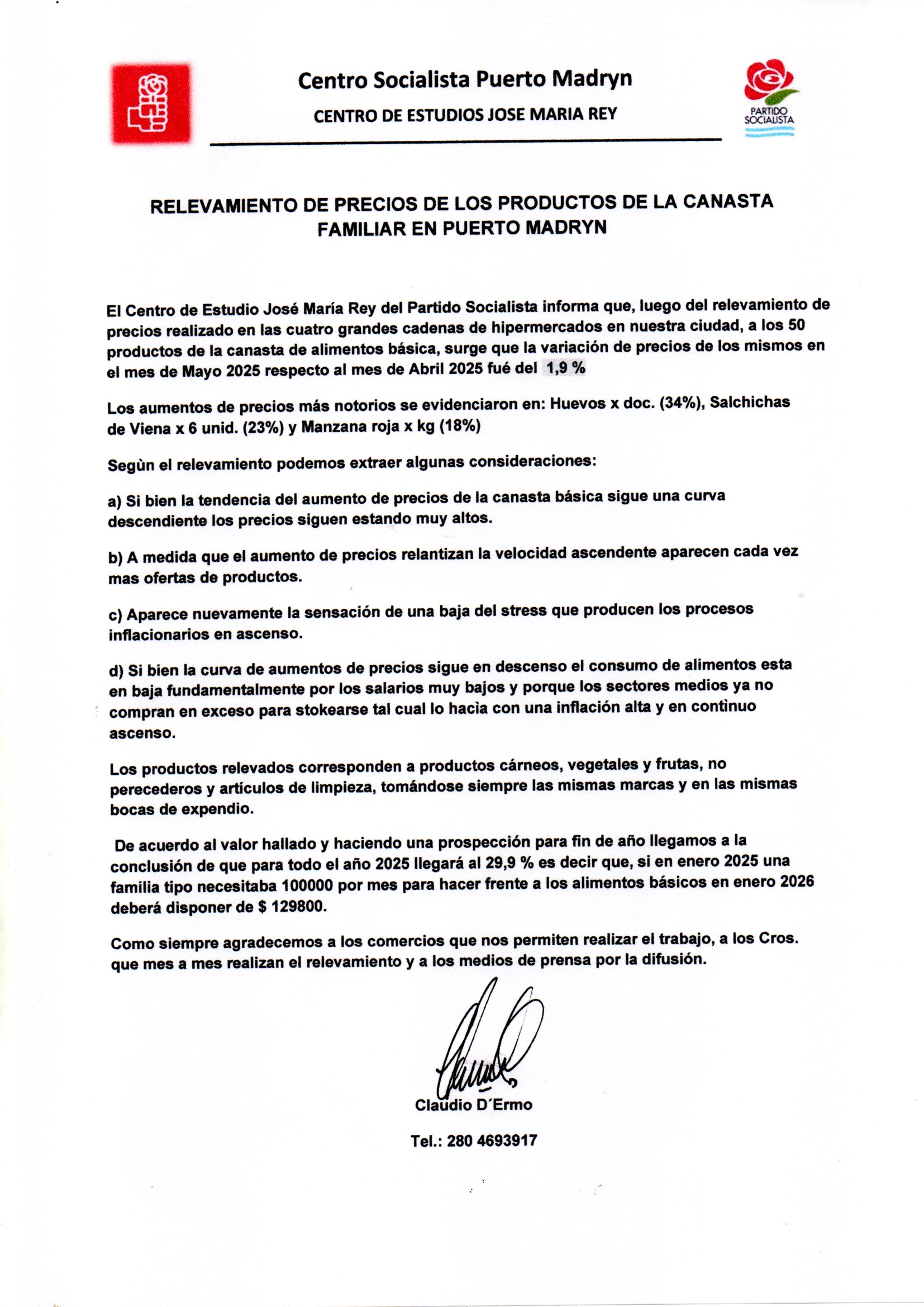 El Centro de Estudios José María Rey del Partido Socialista difundió su último relevamiento de precios de productos de la canasta familiar en la ciudad, con datos correspondientes al mes de mayo de 2025. La investigación, realizada en las cuatro principales cadenas de hipermercados locales, arrojó un aumento promedio del 1,9 % respecto de abril.