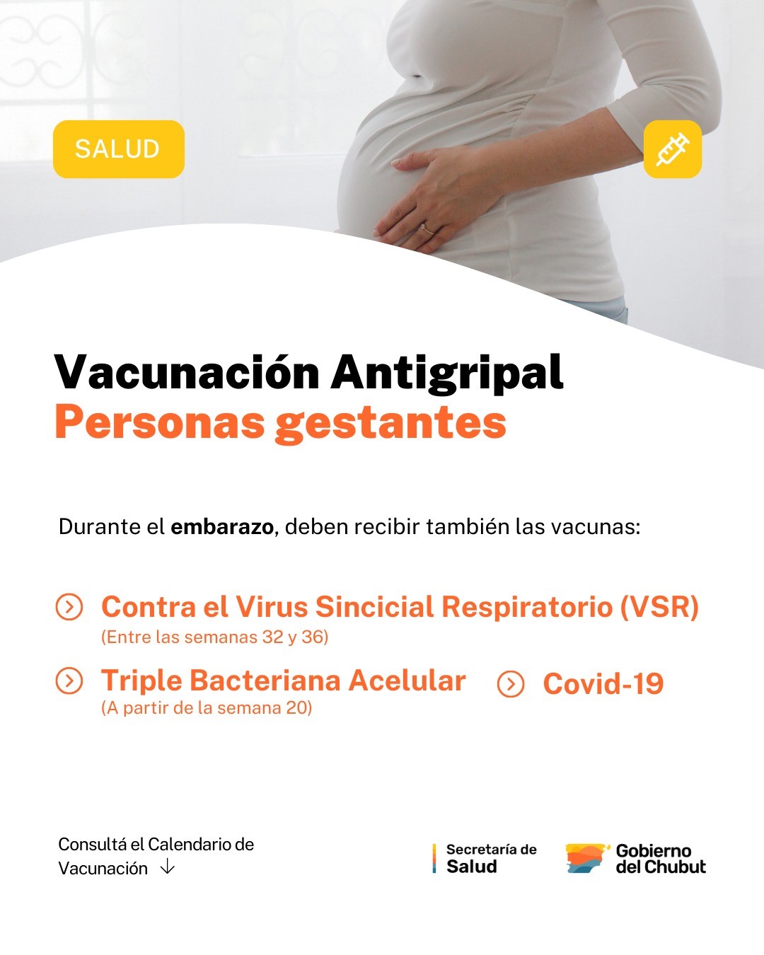 Asimismo, desde la Secretaría de Salud se recordó a la población que la Campaña de Vacunación Antigripal es una oportunidad para completar el resto de las vacunas del Calendario de Vacunación, como ser la vacuna contra el Covid-19, que está dirigida a todas las personas desde los 6 meses, que deben contar con el esquema primario y las dosis de refuerzo correspondientes; la vacuna Triple Bacteriana Acelular, que está dirigida a las personas gestantes a partir de la semana 20; la vacuna contra el Virus Sincicial Respiratorio (VSR), que está dirigida a las personas gestantes que cursen su embarazo entre las semanas 32 a 36; y la vacuna contra el Neumococo, que está dirigida a las personas de 5 a 64 años con factores de riesgo, y para mayores de 65 años si corresponde.