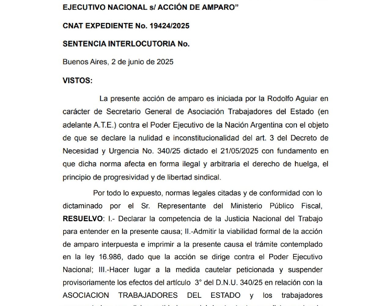 El Juzgado Nacional de Primera Instancia del Trabajo N°3 resolvió hoy hacer lugar a la medida cautelar solicitada por la Asociación Trabajadores del Estado (ATE), suspendiendo provisoriamente los efectos del artículo 3 del Decreto de Necesidad y Urgencia (DNU) 340/25 dictado por el Poder Ejecutivo Nacional el pasado 21 de mayo.