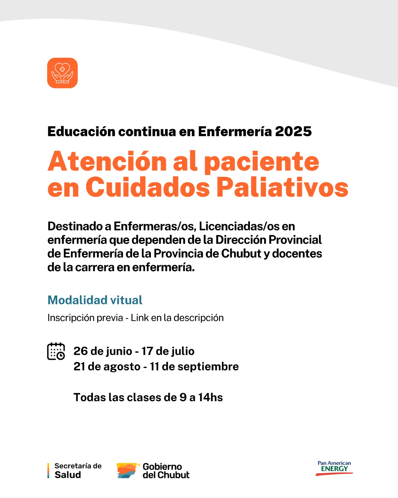 Continuando con las políticas de formación del recurso humano sanitario, el Gobierno del Chubut, a través de la Secretaría de Salud, realizará una capacitación en Atención al Paciente en Cuidados Paliativos.