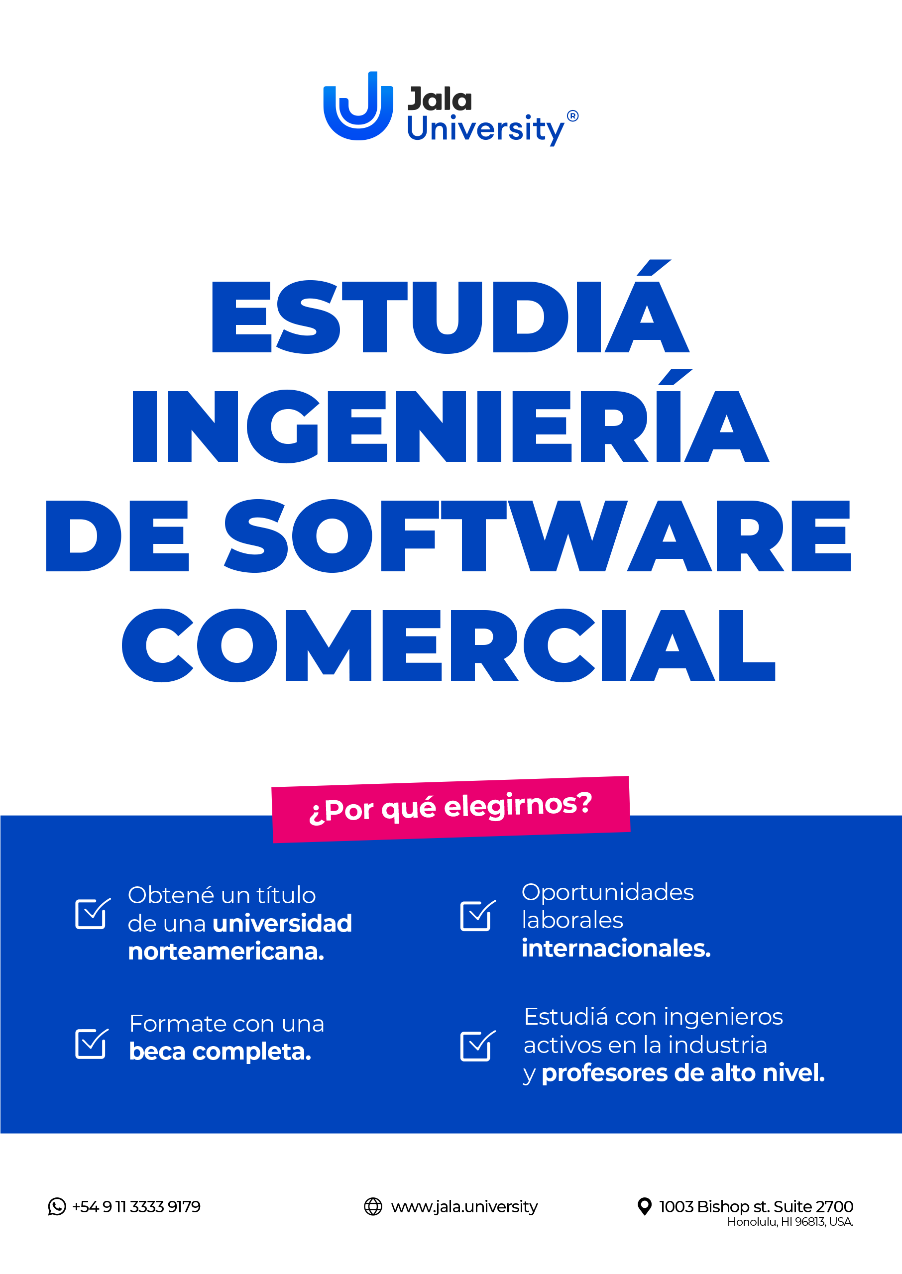 La carrera de Ingeniería de Software Comercial tiene una duración aproximada de cuatro años y está orientada a estudiantes con secundario completo (o en proceso de finalización), conocimientos básicos de informática, pensamiento lógico y disponibilidad de tiempo completo. Se requiere, además, conexión estable a internet y residencia en Argentina.