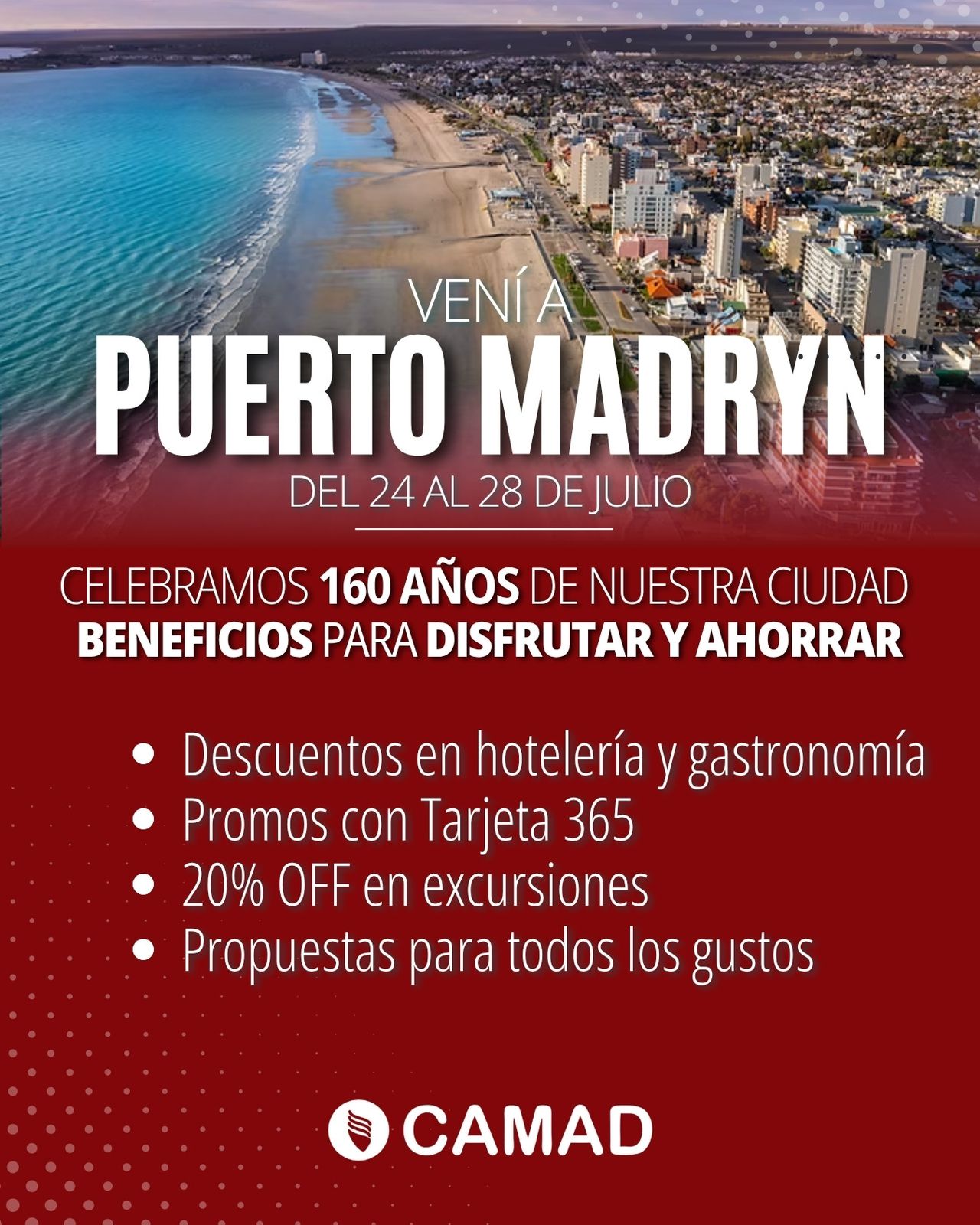 #PuertoMadryn160Años #VisitáMadryn #CAMAD #ComercioLocal #TurismoMadryn #PromosMadryn #GastronomíaMadryn #HoteleríaMadryn #ExcursionesMadryn #AniversarioMadryn #JuntosEsMejor