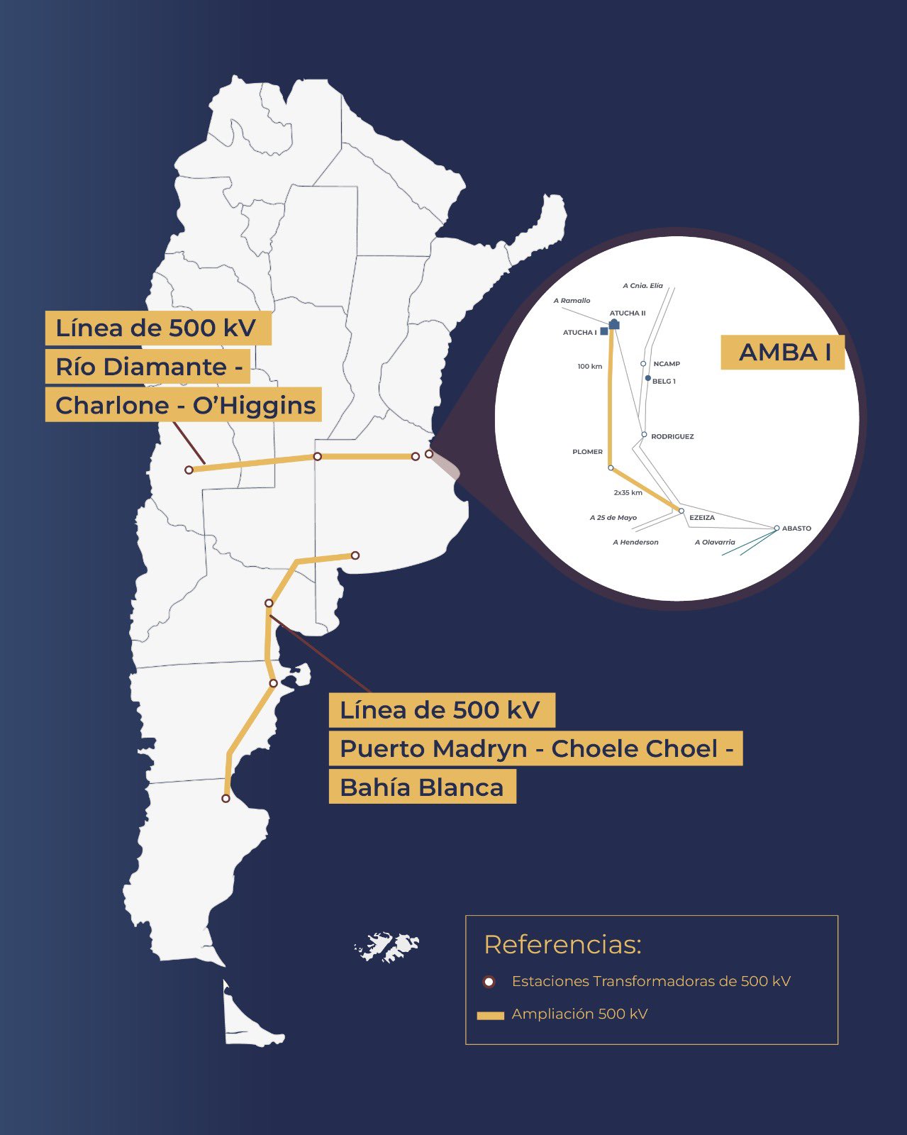 Las obras seleccionadas son AMBA I, que mejorará la capacidad de abastecimiento en el Área Metropolitana de Buenos Aires que concentra el 40% del consumo eléctrico nacional; la Línea de 500 kV Río Diamante – Charlone – O’Higgins, un corredor que permitirá la evacuación de mayor generación renovable y convencional que se puede instalar en la región Cuyo a la vez que permitirá evacuar parte de la generación de COMAHUE; y la Línea de 500 kV Puerto Madryn – Choele Choel – Bahía Blanca, que mejorará la conexión entre la Patagonia y el sistema troncal.