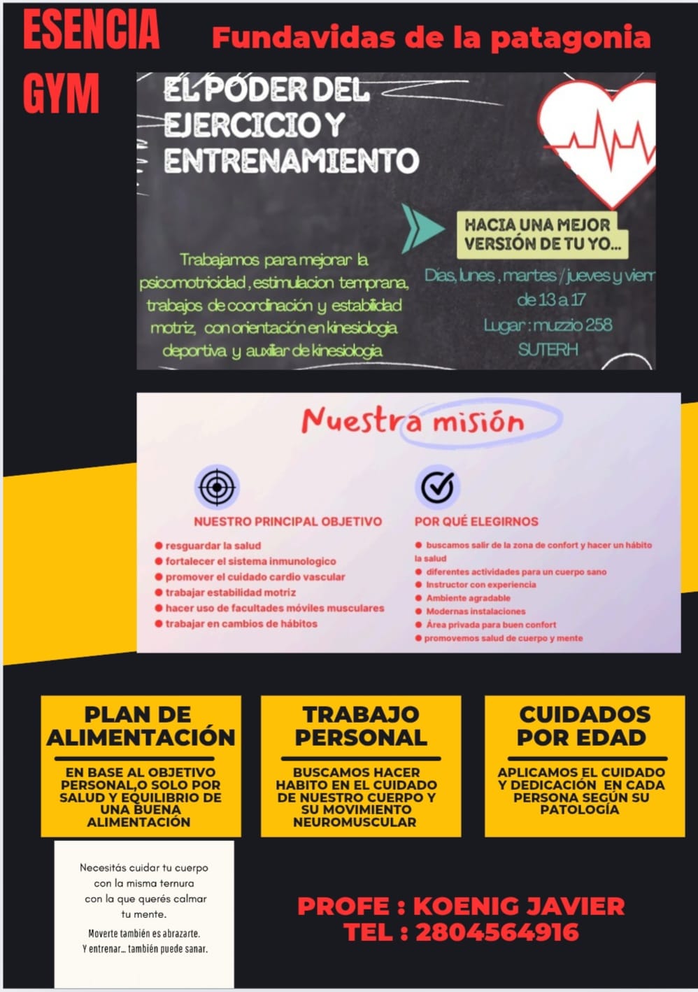 En SUTERH (Muzzio 258), funciona el programa “Esencia” de Fundavidas de la Patagonia, coordinado por el profesor Javier Koenig, que brinda entrenamiento personalizado a personas con patologías oncológicas, lesiones o que simplemente buscan cuidar su salud.